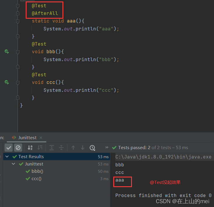 看了上图的举例演示,你可能有一个疑问:刚刚不是说要加@Test注解才能在本类中运行方法吗,那上面图中的aaa()方法为什么在没加@Test注解的情况下也执行了呢?