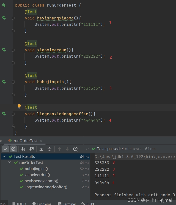 方法的排序——通过在方法上加@Order注解来排序方法,同时在被@Order注解的方法所在的类上面要加上@TestMethodOrder(MethodOrderer.OrderAnnotation.class)注解,表示当前类使用方法来进行排序