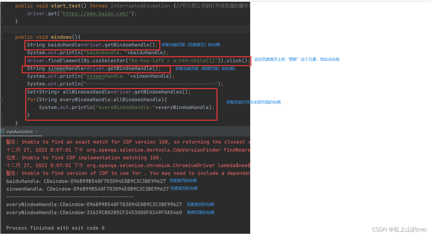 下面这个是举例:当前是百度首页,获取当前页面句柄。然后点击百度首页上的“新闻”超链接,此时打开了一个新的页面(新闻超链接对应的页面),获取当前页面句柄(当然根据我们上面所说,你应该知道这里为什么句柄还是百度首页的句柄),最后获取目前所有页面的句柄。