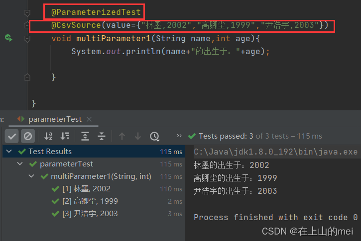 @CsvSource(value={"第一对的参数1,第一对的参数2","第二对的参数1,第二对的参数2"})