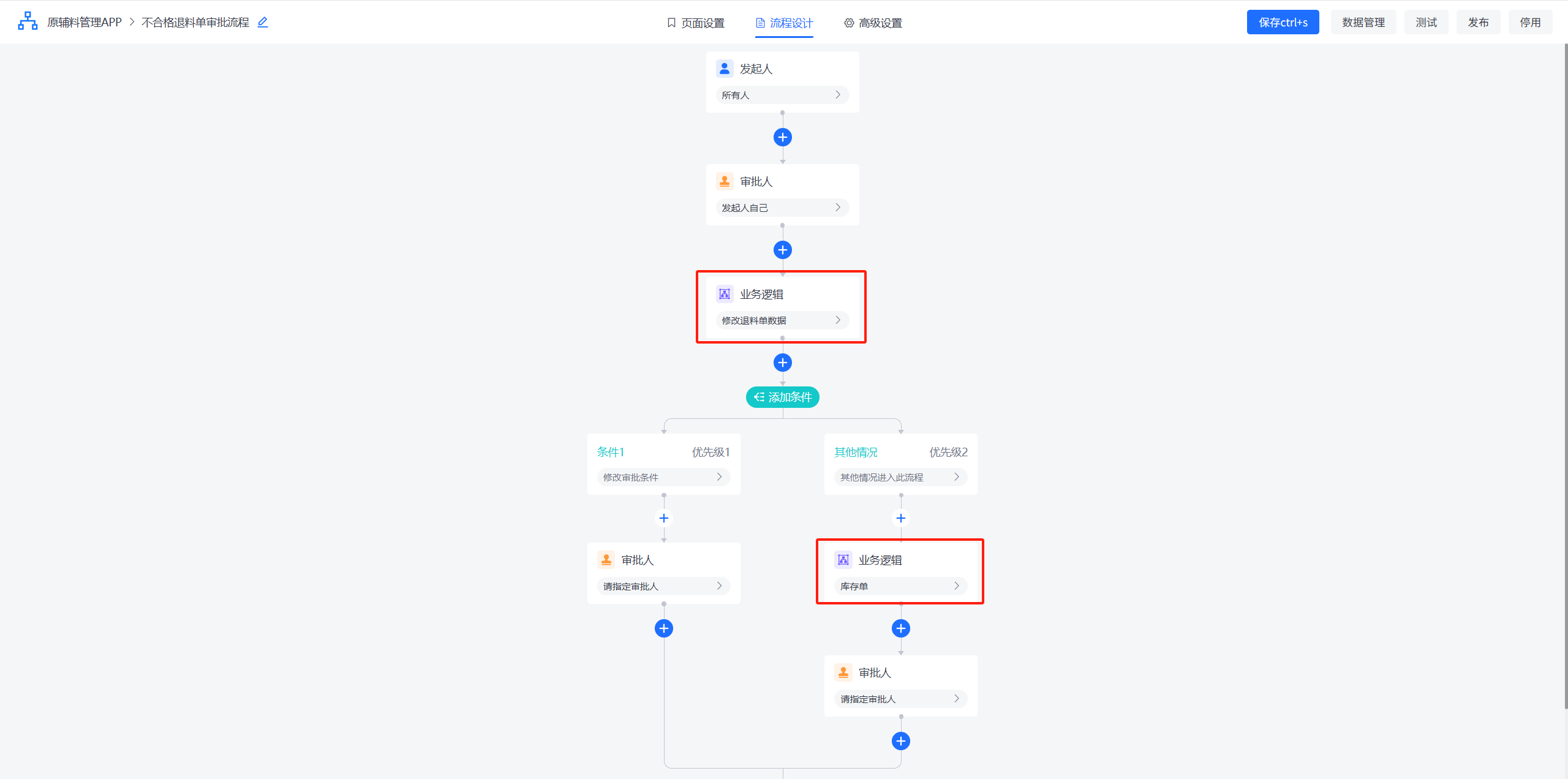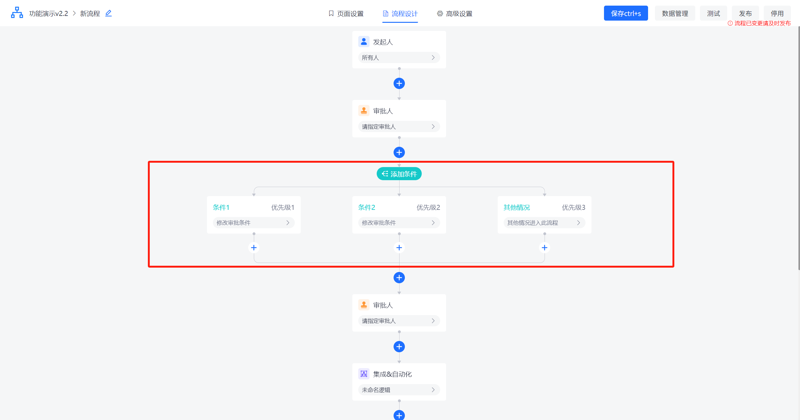 通过分支节点可以配置更复杂的分支条件,多个条件组合,解决流程分支多、节点多的问题。