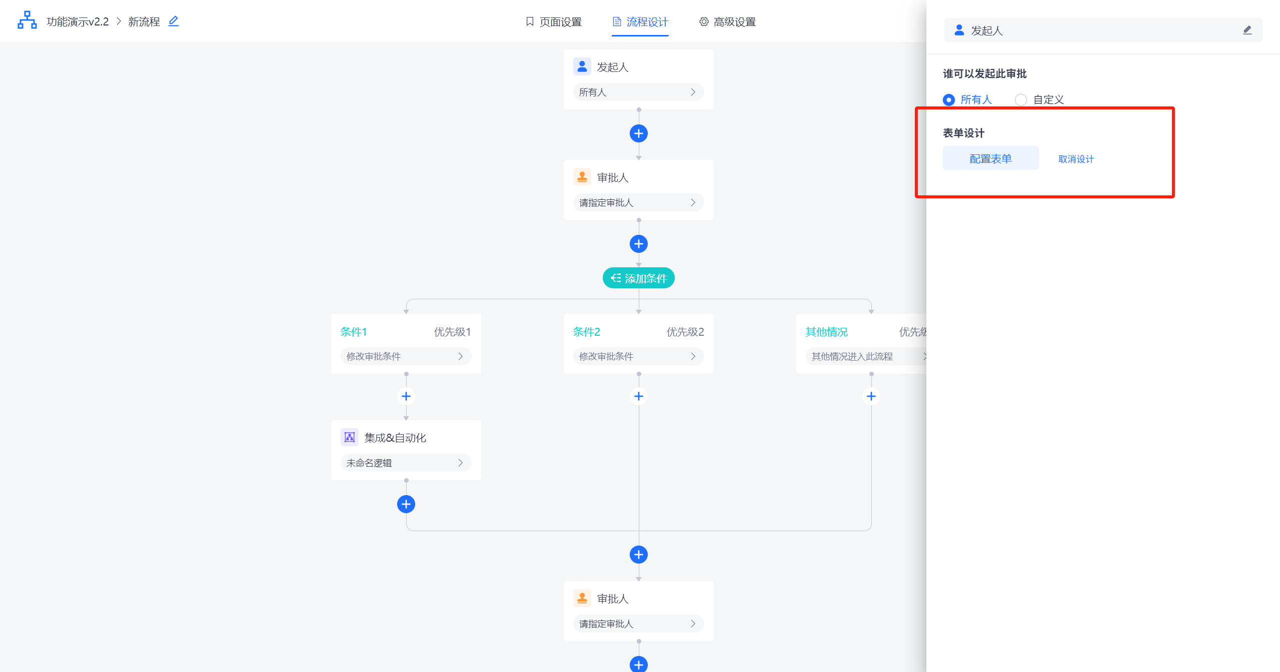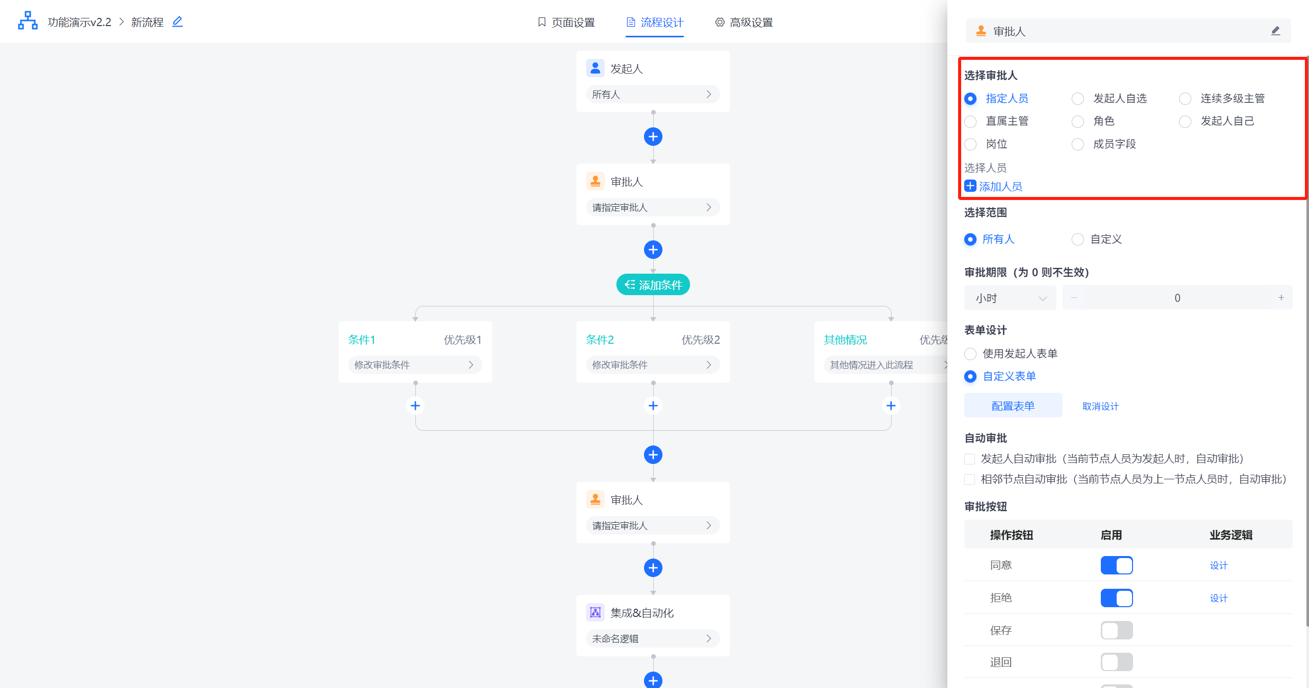 每个节点可以设置自定义表单、可以选用已经有的表单、可以默认发起人的表单 ,可以实现多种审批的方式(会签、或签、按比例、按顺序等),支持多种按钮与逻辑触发的自定义等,可以触发逻辑(自动化业务,也就是人工流产业务可以触发自动功能)。