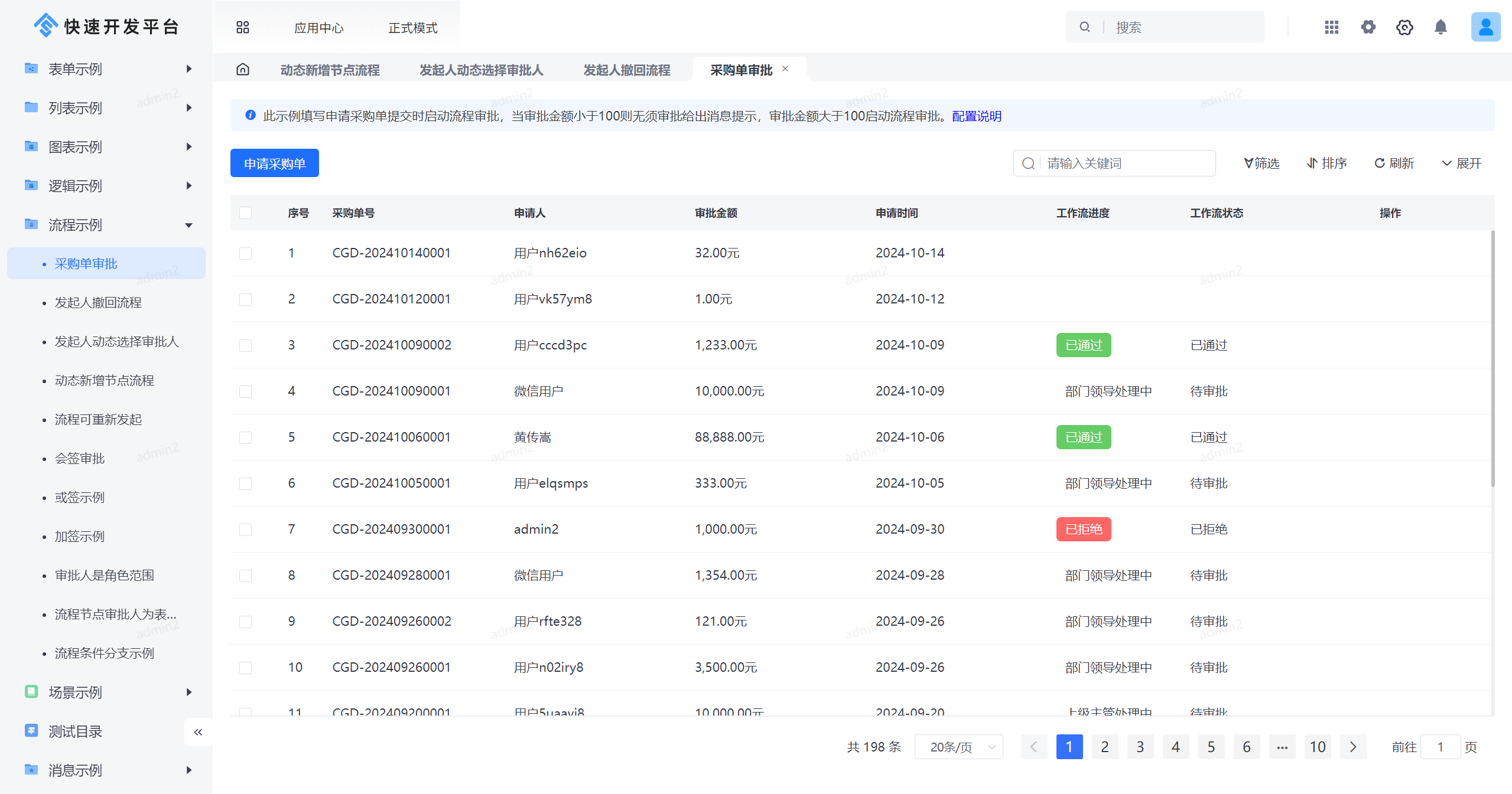 在企业管理中,经常会有复杂的业务流程场景,通过流程引擎,企业可以轻松构建请假、报销、采购等审批流程。流程是作为人员与人员之间业务流转配置的核心能力,在低代码开发中也是非常重要的引擎。它允许用户以图形化方式设计和配置工作流程,包括任务分配、工作流程的顺序和条件、并行处理等。
