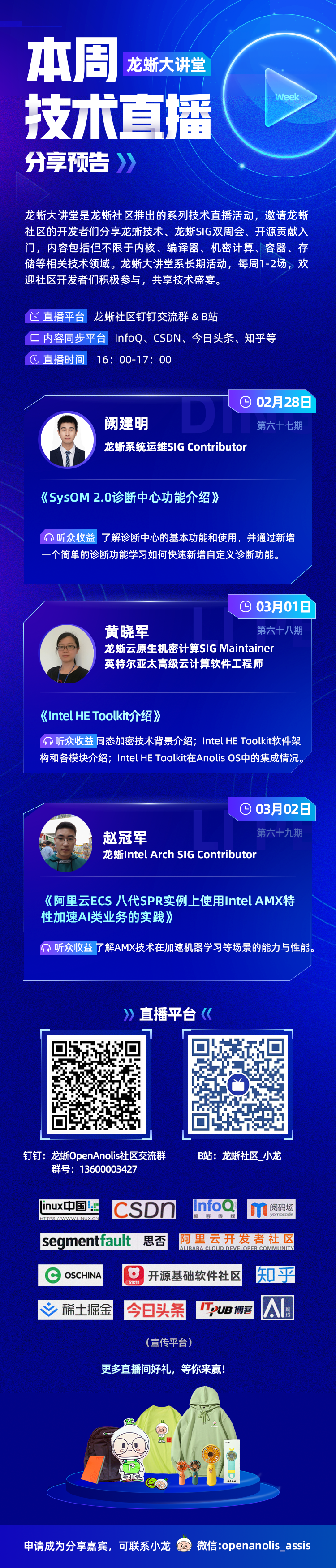 本周 3 期「龙蜥大讲堂」预告来啦!我们邀请了系统运维 SIG Contributor 阙建明分享《SysOM 2.0 诊断中心功能介绍》,龙蜥社区云原生机密计算 SIG Maintainer、Intel 高级云计算软件工程师黄晓军分享《Intel HE Toolkit 介绍》主题演讲,龙蜥社区 Intel Arch SIG Contributor 赵冠军分享《阿里云 ECS 八代 SPR 实例上使用 Intel AMX 特性加速 AI 类业务的实践》主题演讲,精彩多多,快来扫码入群,预定前排小板凳观看直播!