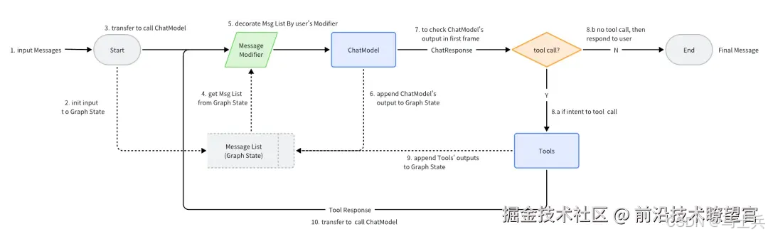 以 ReAct Agent 为例:一个 ChatModel(大模型),“绑定” 了 Tool(工具),接收输入的 Message,由 ChatModel 自主判断是否调用 Tool 或输出最终结果。Tool 执行结果会再次成为给到 ChatModel 的 Message,并作为下一轮自主判断的上下文。