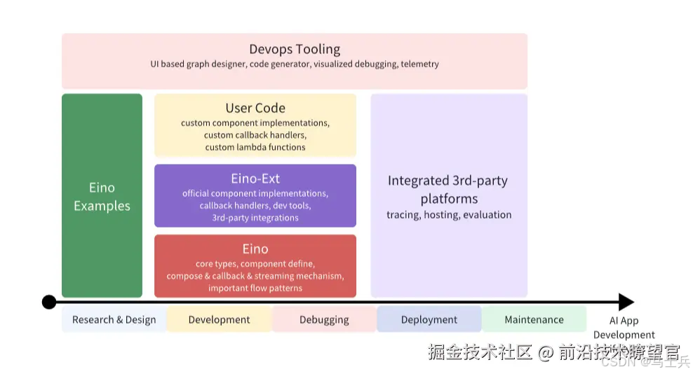 Eino 是覆盖 devops 全流程的大模型应用开发框架,从最佳实践样例的 Eino Examples,到各环节的工具链,都是 Eino 的领域: