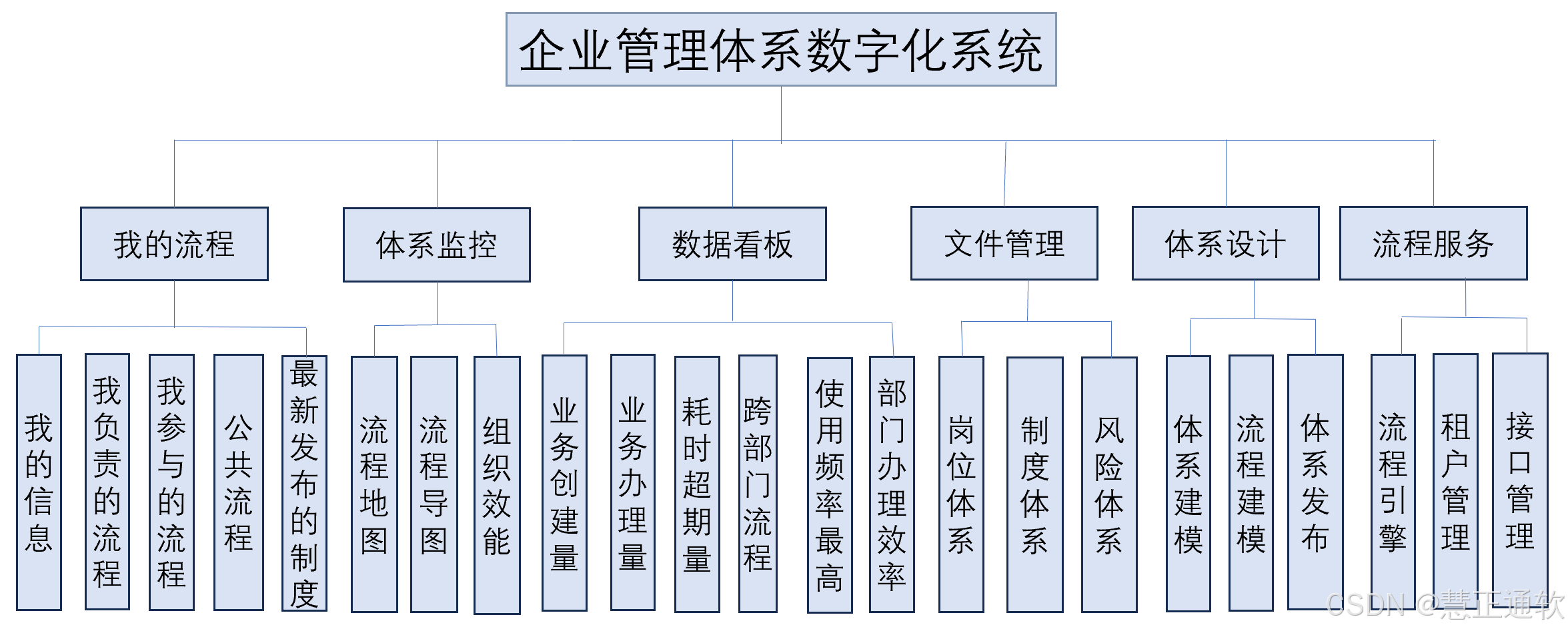 企业管理体系数字化系统包括“我的流程”、“体系监控”、“数据看板”、“文件管理”、“体系设计”、“流程服务”功能。