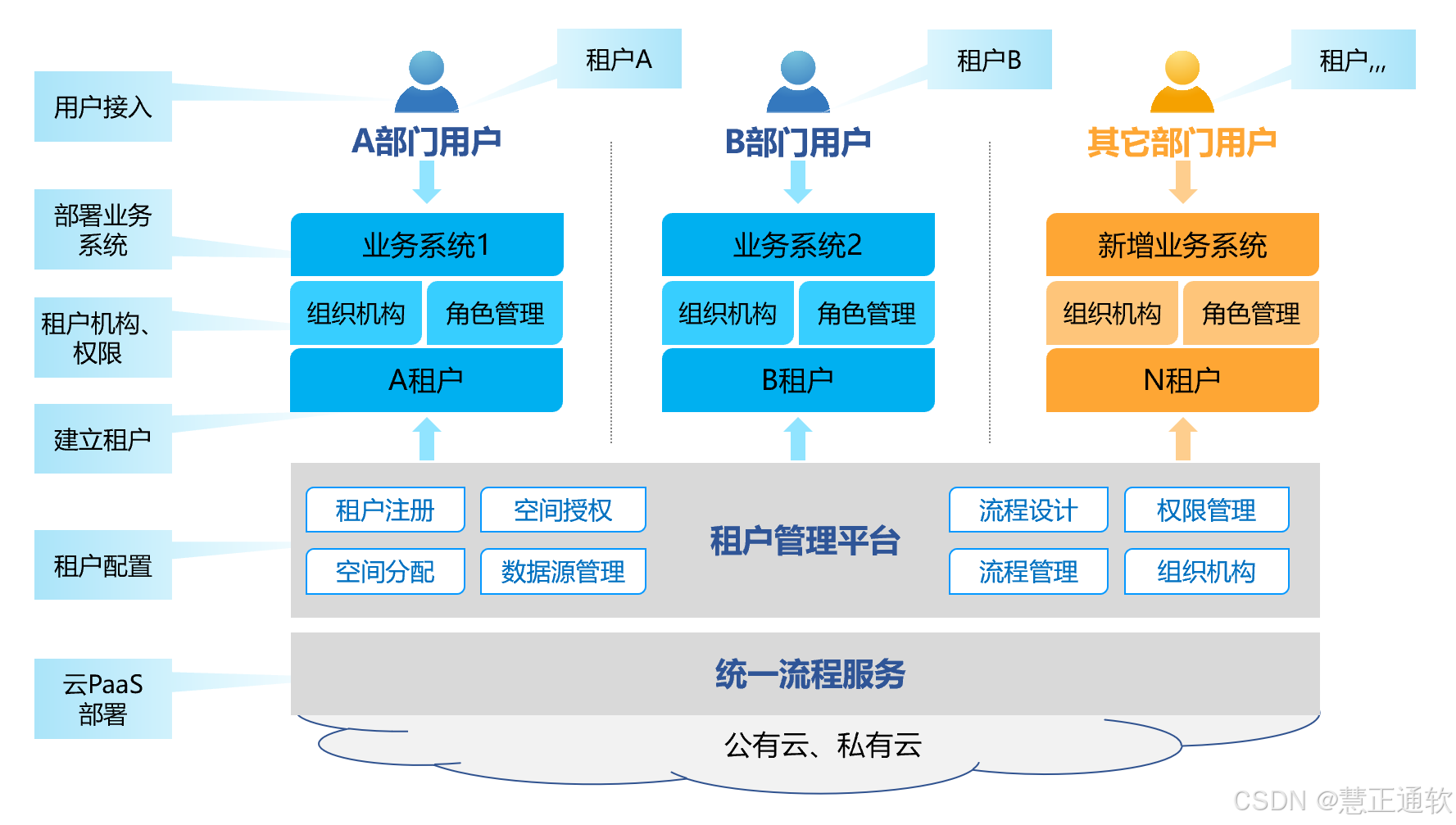 车同轨:流程接口统一,流程引擎分租户为所有业务系统提供统一流程接口,实现流程端到端打通;