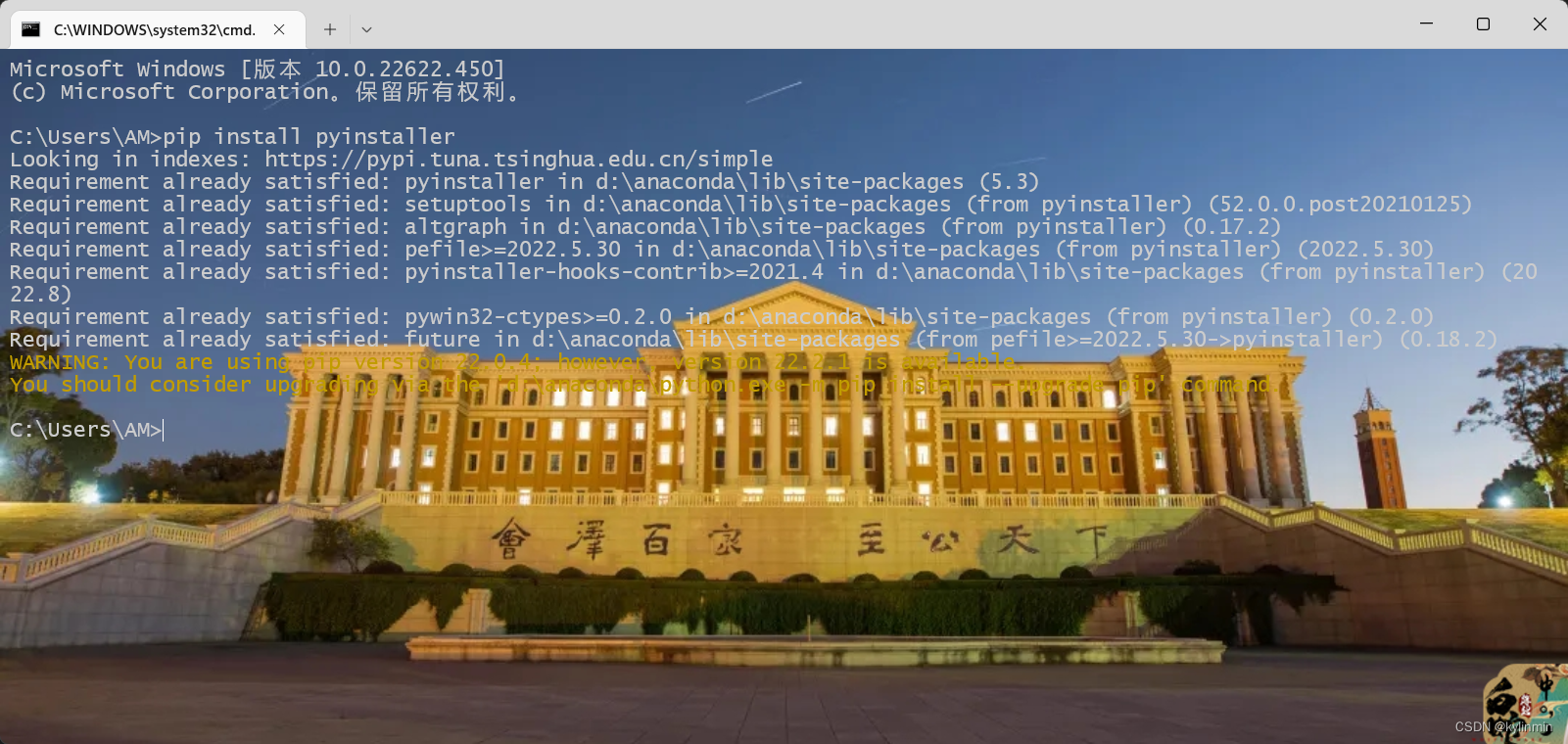 1.Python 默认并不包含 PyInstaller 模块,因此需要自行安装 PyInstaller 模块。使用pip工具进行安装pyinstaller,cmd命令行打开后输入