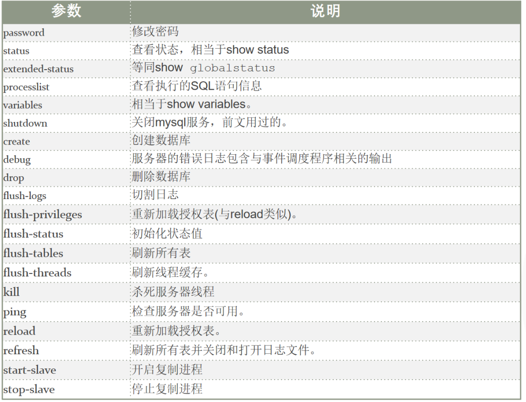 mysqladmin是用于执行管理操作的客户端,可以使用它来检查服务器的配置和当前状态,创建和删除数据库,等等。主要体现在不需要登录mysql命令行里边,可以直接执行命令。其实这部分个人觉得没多少差别。