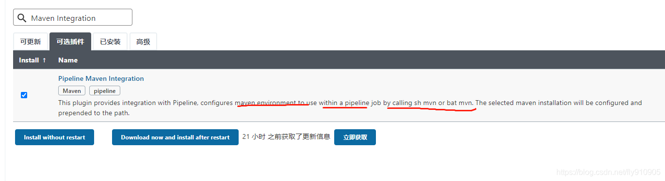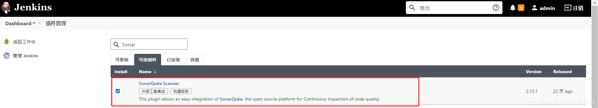 从Jenkins的“系统管理”-“管理插件”中找到SonarQube Scanner插件并下载安装,重启Jenkins后生效。