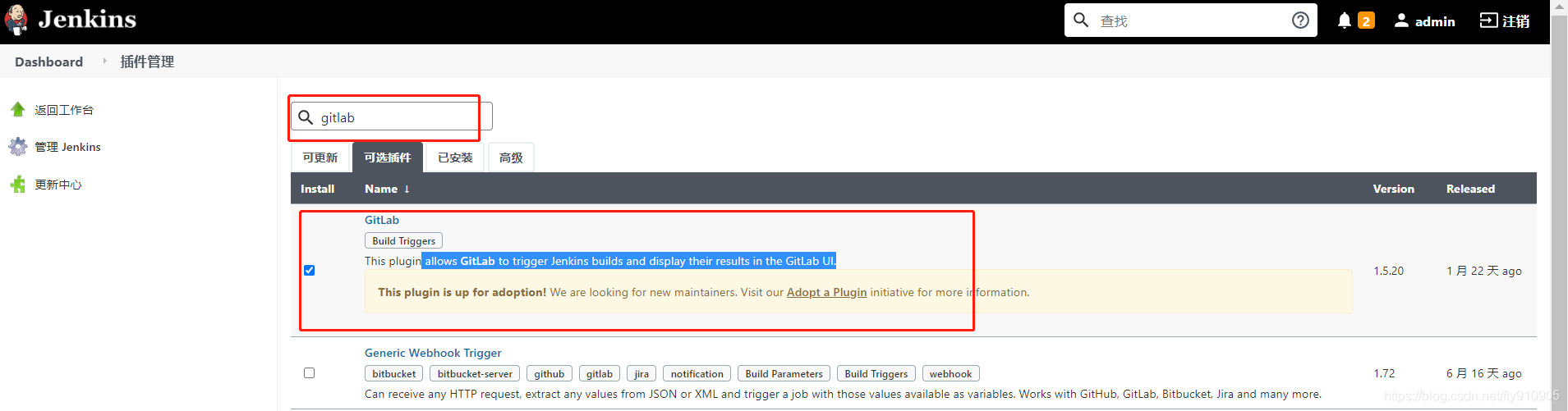 Jenkins中添加GitLab插件,选择直接安装,然后服务器中重启Jenkins。