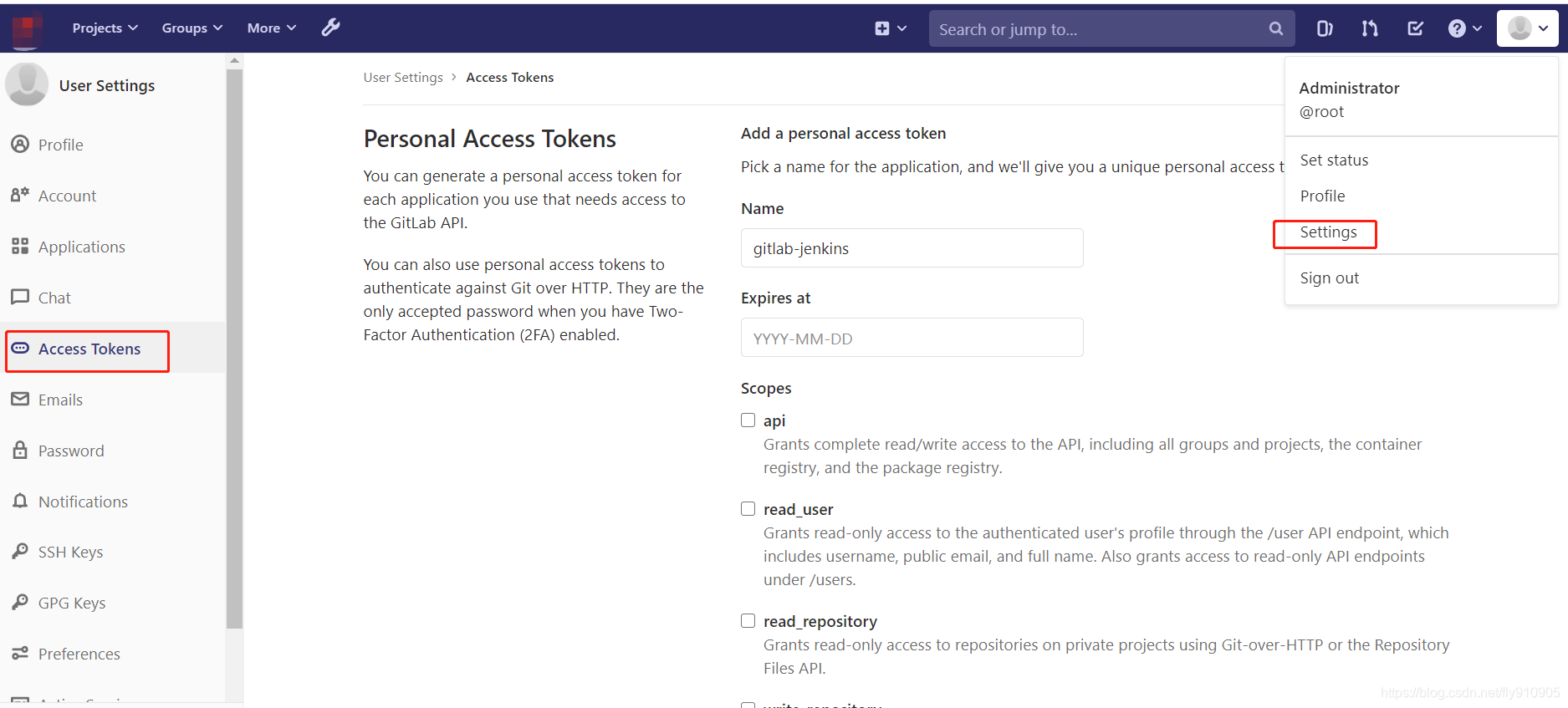 GitLab,在GitLab中用户设置—>访问令牌选项中生成token,scope为第一个等级:api
