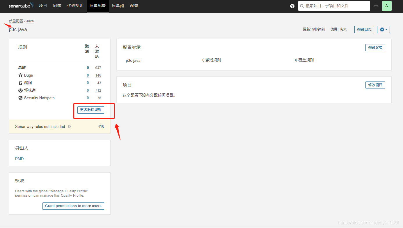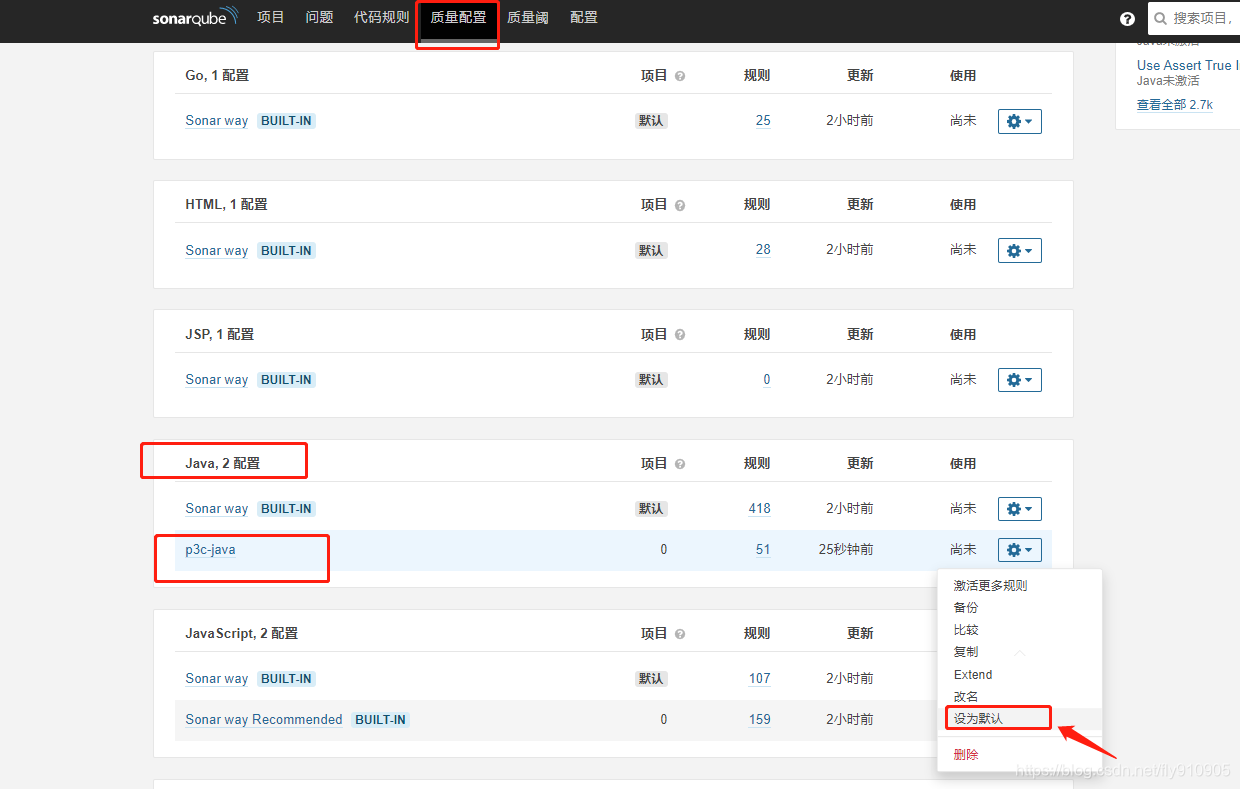 管理员帐户登陆Sonarqube,【质量配置】-创建,填写【名称】和选择【语言】,点击【创建】p3c-java