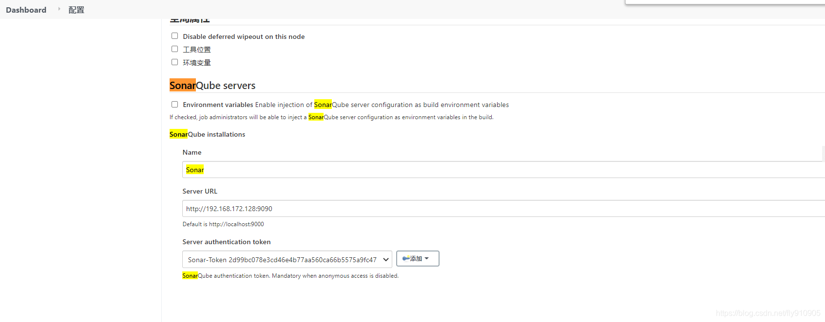 系统管理–>系统设置–>SonarQube servers,填写Name和Server URL,Name可以随意填写,Server URL就是SonarQube的url地址,
