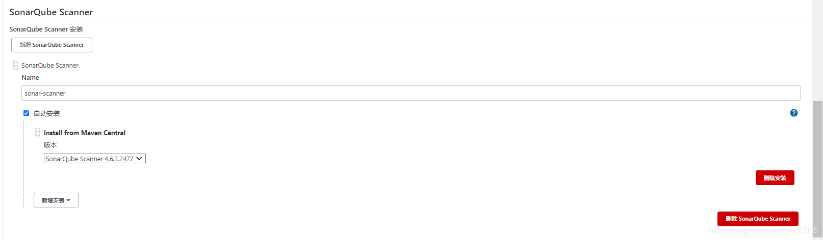 “系统管理”-“全局工具配置”-“SonarQube Scanner”,点击“SonarQube Scanner 安装”并配置SonarQube Scanner。