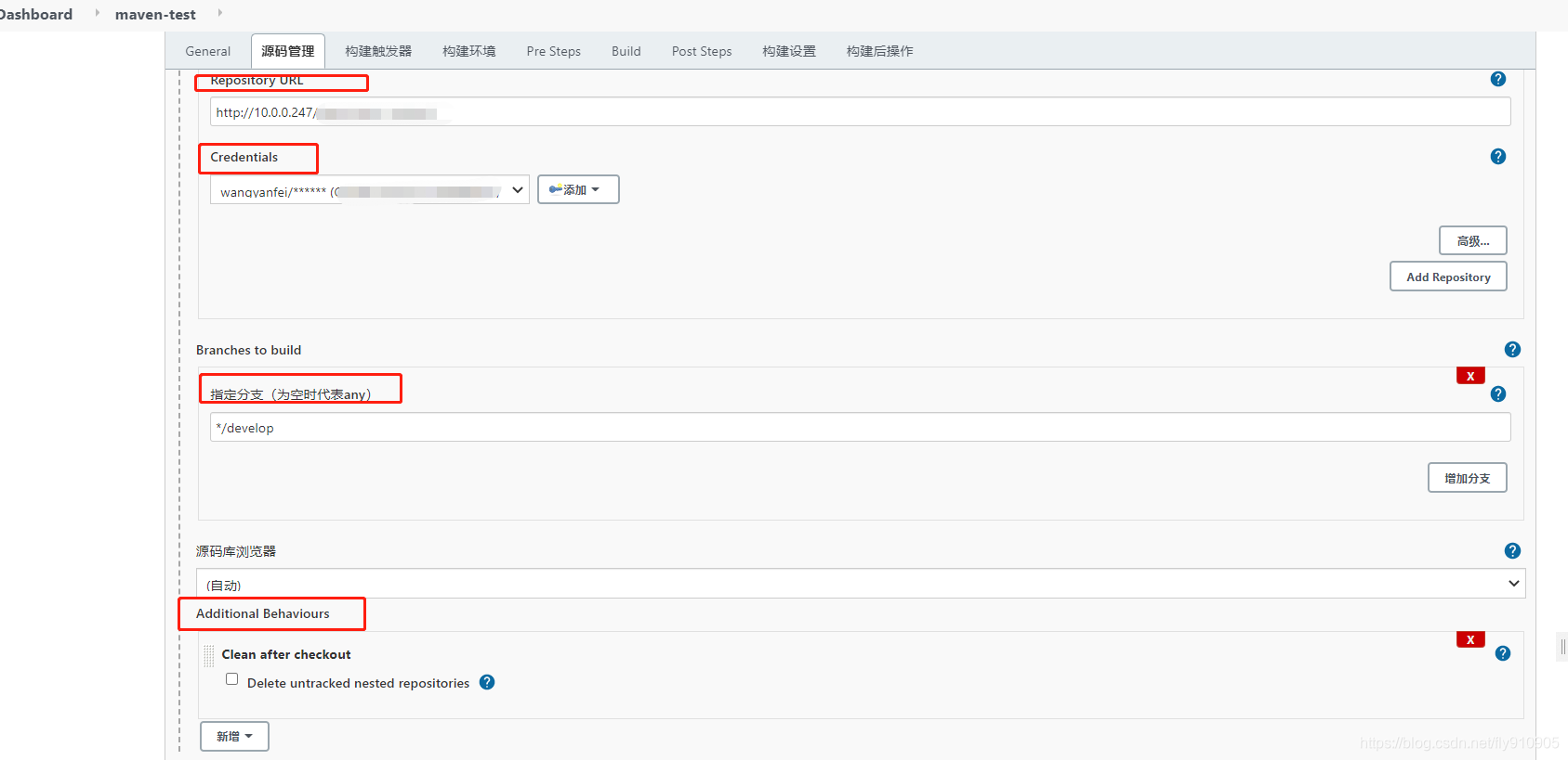 源码管理设置部分,选择“Git”,配置好工程的git地址以及获取代码的凭证信息。然后在“Additional Behaviours”中添加“Clean before checkout”。可以根据自己的需要在“Branches to build”中设置所需要获取的代码分支。