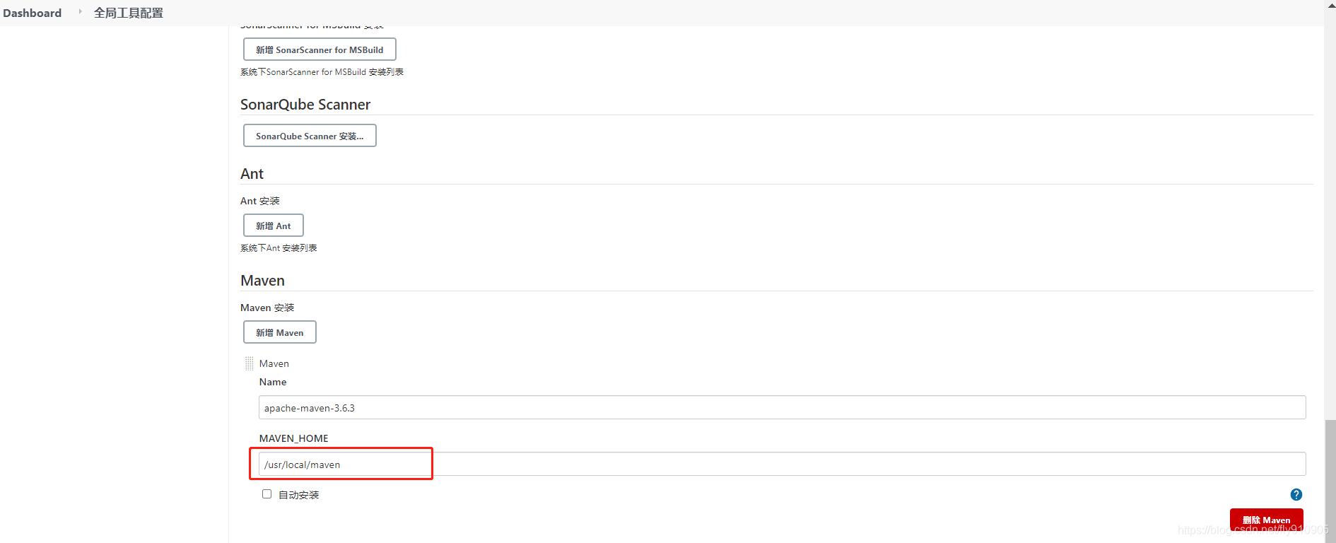 - 使用install/jenkins-sonarqube-docker-V2/plugin/apache-maven-3.6.3创建Maven环境