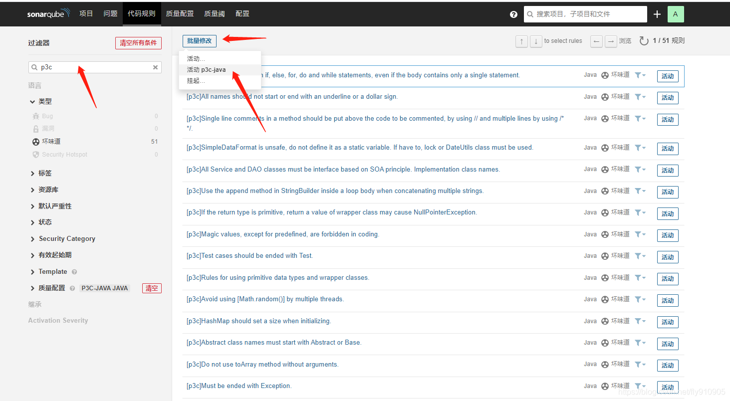 进入激活界面后,输入【p3c】过滤出规则,规则前都有【p3c】标识,选择【批量修改】,点击【激活p3c-java】