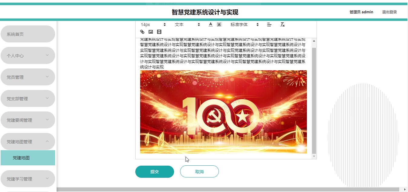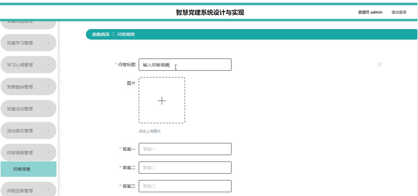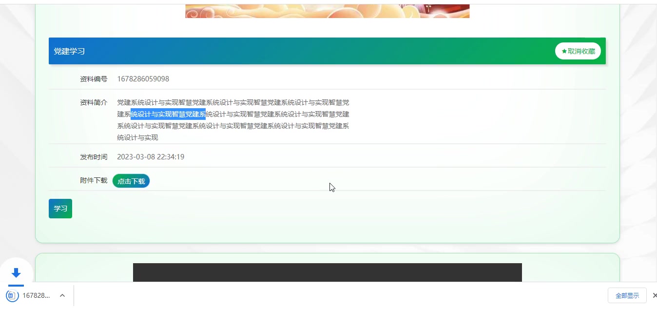 该智慧党建系统采用b/s架构,并采用java语言以及springboot框架进行开发。本系统主要设计并完成了用户登录管理过程、个人信息修改、对党员管理、党支部管理、党建要闻管理、党建地图管理、党建学习管理、学习心得管理、党费缴纳管理、党建活动管理、活动报名管理、问卷调查管理、问卷回答管理、民主投票管理、投票信息管理、试题管理、学习测试管理、系统管理、考试管理等功能进行管理。该系统操作简单,界面设计简单,不仅能基本满足目前智慧党建管理的日常管理工作,而且能有效降低人员成本和时间成本,为智慧党建管理工作提供方便。