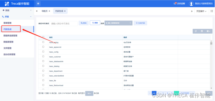 3.3 使用教程配置数据源首选需要有数据库源,因为代码生成是根据数据库表来生成的。 菜单:开发=>开发=>数据库连接管理若列表中没有目标数据源,则添加数据库连接数据连接名、连接字符串、数据库类型即可。添加完成后即可看到连接字符串信息。生成代码有了数据库连接之后,即可进行代码生成。 菜单:开发=>快速开发=>代码生成选择数据库,然后勾选需要生成代码的数据库表,点击生成代码会弹