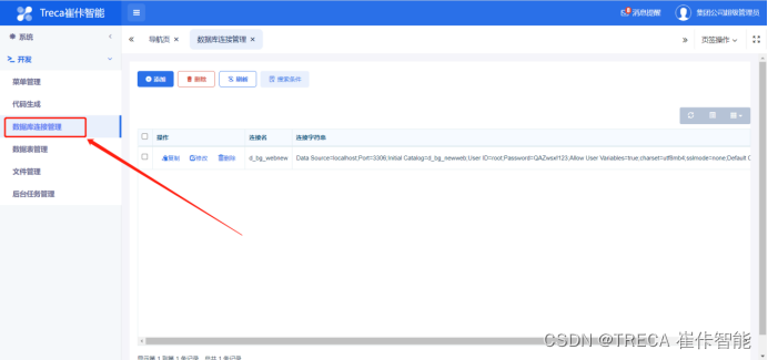首选需要有数据库源,因为代码生成是根据数据库表来生成的。 菜单:开发=>开发=>数据库连接管理