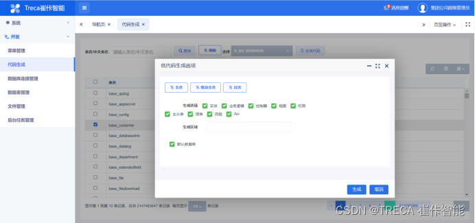 选择数据库,然后勾选需要生成代码的数据库表,点击生成代码会弹出生成选项(这里暂时只能勾选Dev_Project,其余表全是系统基础表,不要勾选,否则会被覆盖,导致异常,请勾选自己的业务表进行生成):