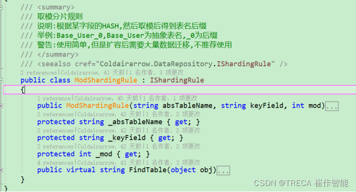 上述代码中完成了Sharding的配置: ShardingConfigBootstrapper.Bootstrap()在一个项目中只能执行一次,所以建议放到Application_Start中(ASP.NET Core中的Startup) AddDataSource是指添加数据源,数据源可以看做抽象数据库,一个数据源包含了一组同类型的物理数据库,即实际的数据库。一个数据源至少包含一个物理数据库,多个物理数据库需要开启主从复制或主主复制,通过ReadWriteType(写、读、写和读)参数来指定数据库的操作类型,通常将写库作为主库,读库作为从库。同一个数据源中的物理数据库类型相同,表结构也相同。 配置好数据源后就可以通过AddAbsDb来添加抽象数据库,抽象数据库中需要添加抽象数据表。如上抽象表Base_UnitTest对应的物理表就是Base_UnitTest_0、Base_UnitTest_1与Base_UnitTest_2,并且这三张表都属于数据源BaseDb。分表配置当然需要分表规则(即通过一种规则找到具体数据在哪张表中)。 上述代码中使用了最简单的取模分片规则, 源码如下:
