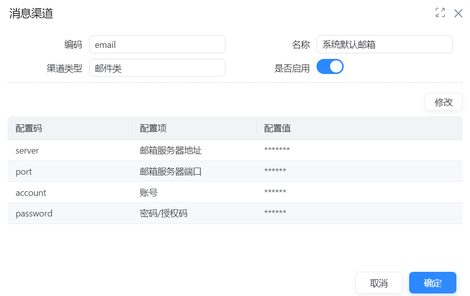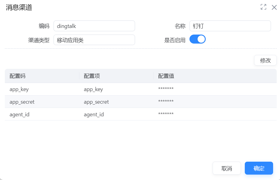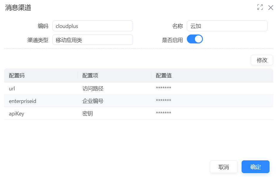 该功能适用于实施人员查看、修改消息渠道参数。配置消息渠道参数时,只可修改配置值