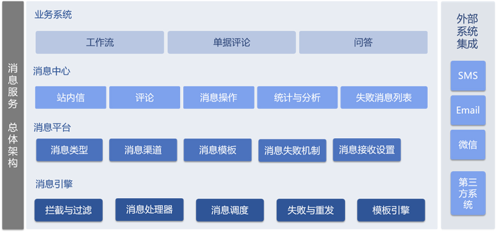 inBuilder低代码平台有很多地方需要对结果发送云加、短信、邮件及GS消息等,并对这些不同的消息进行查看、处理。为了统一消息的发送,inBuilder封装了消息服务接口;为了查看、管理接收到的消息,提供了消息中心功能;为了管理不同业务的消息发送配置,提供了消息平台功能。