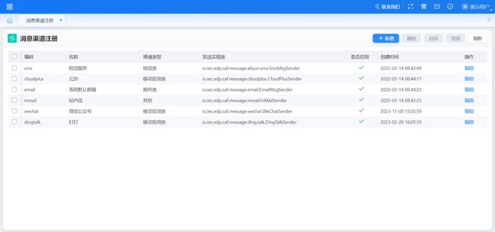 功能入口:【系统公共】-【消息中心】-【消息平台】-【消息渠道注册】。