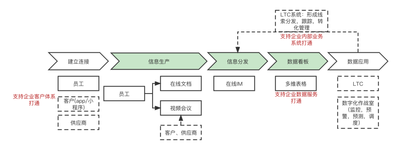 从信息传递链路上看,飞书Office满足了内部员工的日常沟通,会议讨论,数据看板等高效协作的需求。但在外部角色参与协作,数据应用方面还缺少对应的产品支撑。