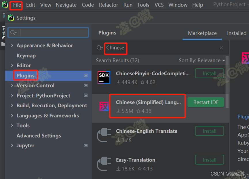 2、左上角File(文件)--选择Settings(设置)--选择Plugins(插件)--输入框输入Chinese--选择自己喜欢的汉化插件(上面那个ChinesePinyin不是汉化包,别装错了)--点击Install--下载之后在Install内选择下载的汉化包--点击OK--重启Pycharm