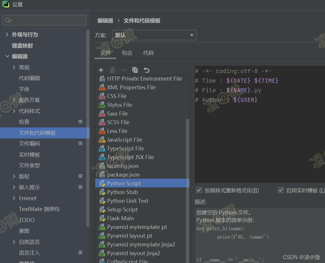 2、设置--编辑器--文件和代码模板--Python Script--文本框内输入想要的模板