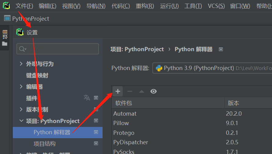 2、左上角文件--设置--项目--python解释器--点击+号(如果想要删除库,选择相应的库,点击—号确定即可)