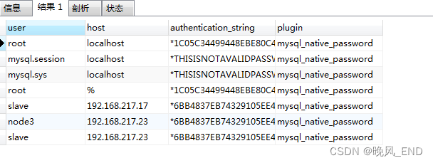 此命令为新建用户slave,该用户只可以远程连接从节点17,密码为123456,此时用户状态应该是这样的: