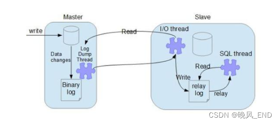 MySQL主从复制涉及到三个线程,一个运行在主节点(log dump thread),其余两个(I/O thread, SQL thread)运行在从节点,如下图所示:
