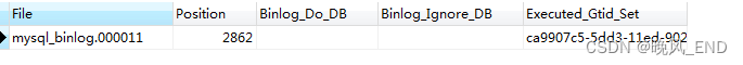 show master status; 输出如下,由于MySQL的配置文件内是同时开启了GTID,因此,最后是有显示GTID的,不过该值目前不需要使用,主要是mysql_binlog.000011和端点2250