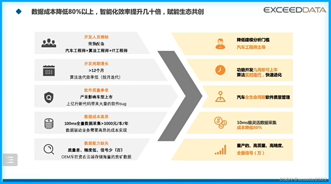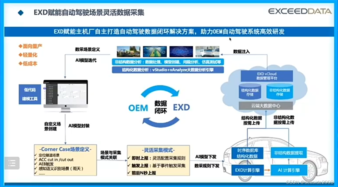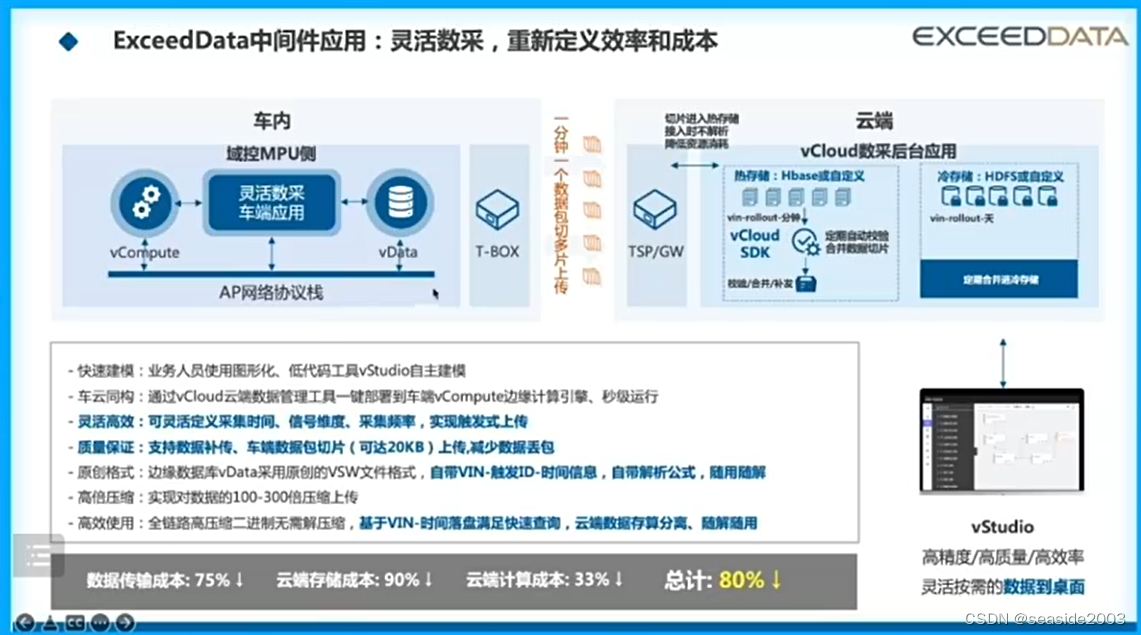 本文主要根据,智协慧同胡勇的视频中整理,各位可以详细观看视频,主要内容已整理:我在其中get到的主要点:1、不是所有数据都需要上传,因为流量成本太高,带宽也不够;2、车云一体架构,云端计算引擎和车端计算引擎同构设计,相当于车云异构进行了封装,同时也对车端的复杂性进行了封装;3、不需要通过OTA的方式进行下发,可实时下发,即发即用;4、车端数据可进行高质量压缩,为vsw格式,比mdf、brf格式压缩