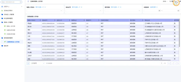 解除隔离管理则是对健康安全的人员进行隔离解除,即在系统上进行详细记录。