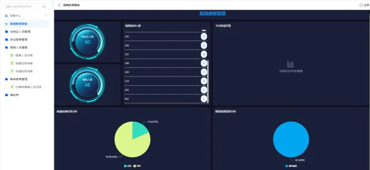 通过隔离数据看板可以将所有隔离人员的数据制作成分析汇总的报表,便于及时了解隔离人员的实时情况及疫情的分析与决策。