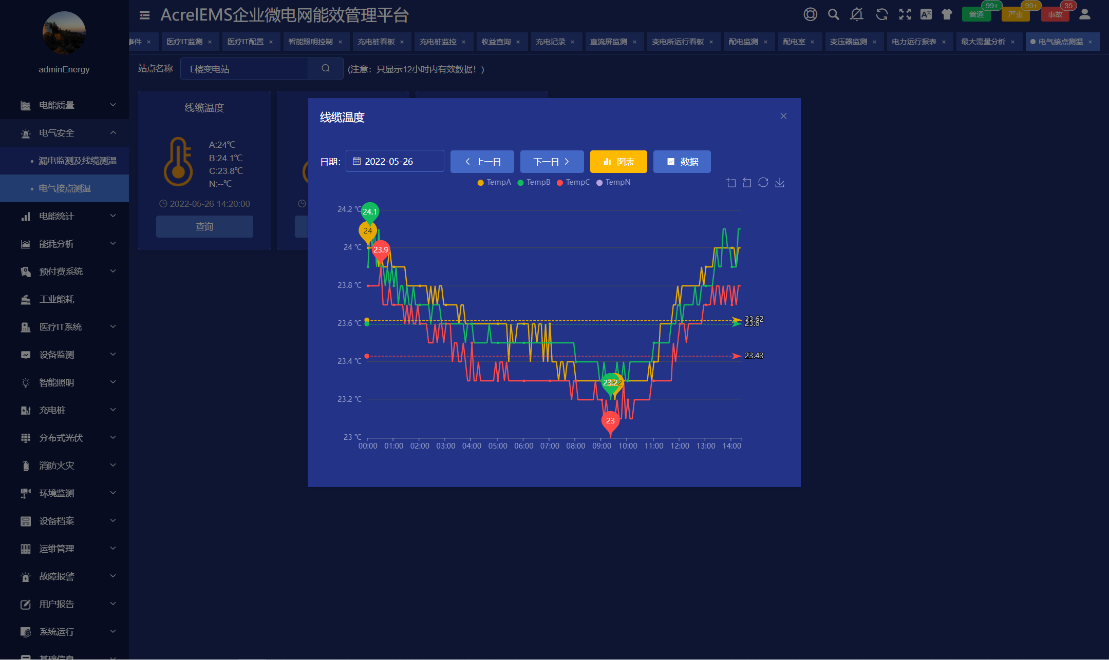 系统监测断路器、母排、线缆接头、密集型母线槽接点温度并实时预警。