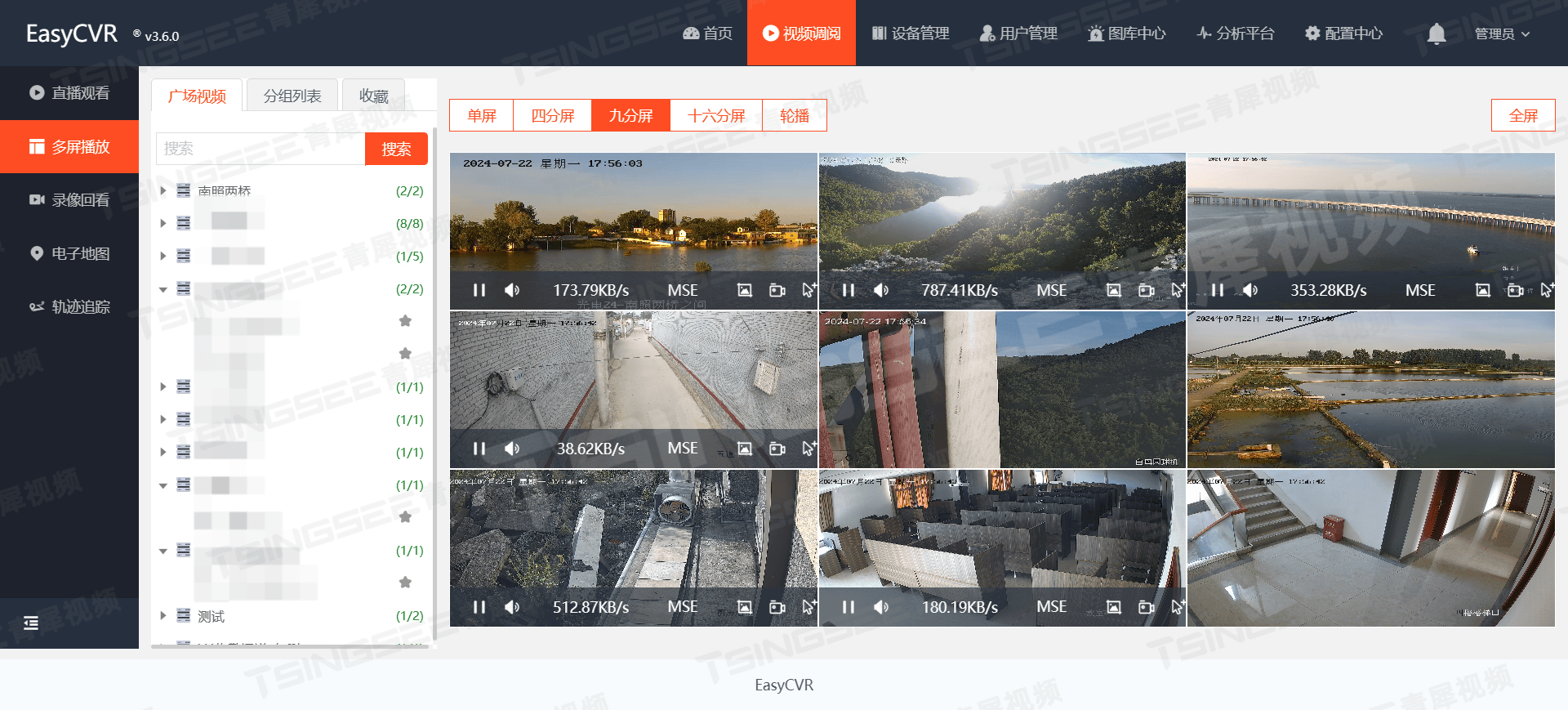 EasyCVR视频汇聚平台具备强大的视频汇聚能力,能够实时处理来自不同源的视频流,可同时播放多路监控视频流,视频画面1、4、9、16个可选,支持自定义视频轮播。这一特性使得智慧社区内的各类视频资源能够被有效整合,形成统一的视频监控网络。