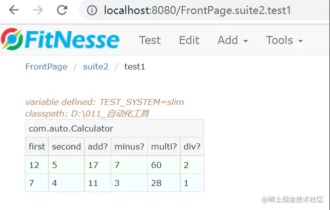 - 第一行表示FitNesse使用SLIM测试系统
