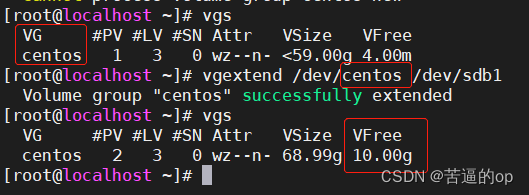 [root@localhost ~]# lvextend -L +10G /dev/centos/root #如果是全部加入可指定100%,命令如下 [root@localhost ~]# lvextend -l +100%FREE /dev/centos/root