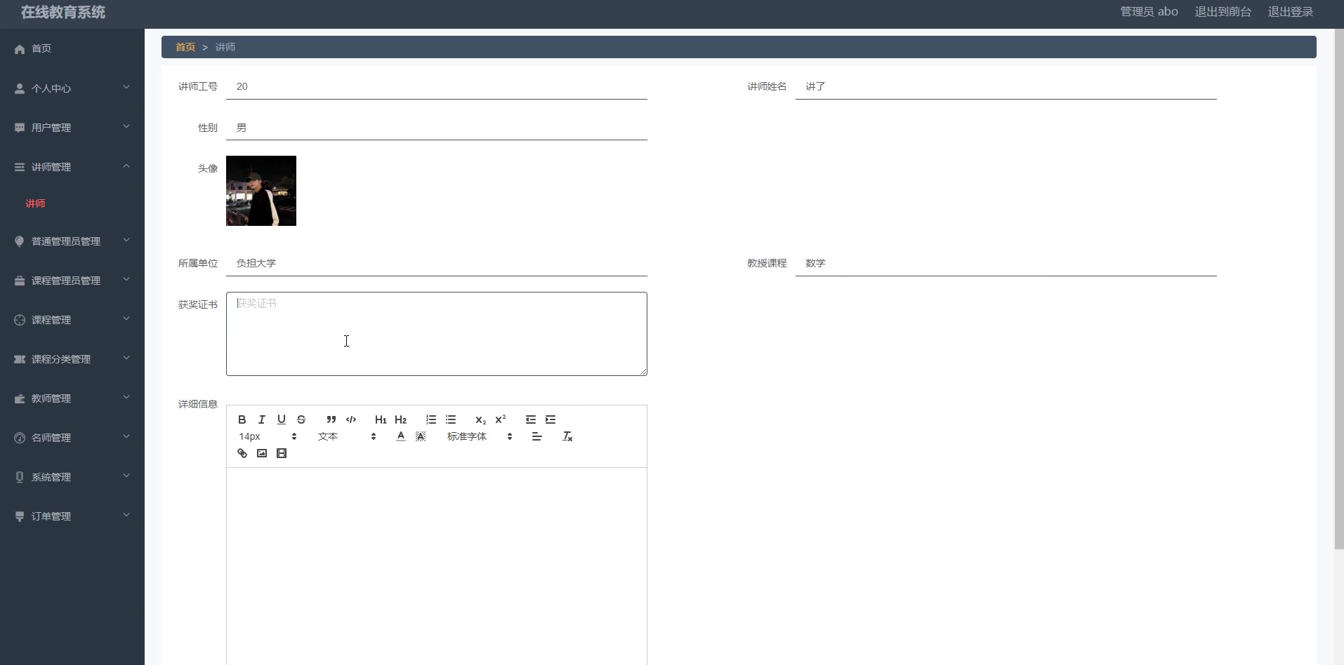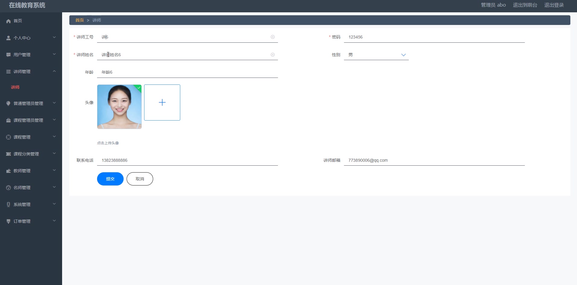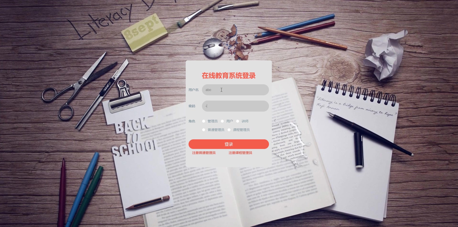 本在线教育系统管理员功能有个人中心,用户管理,讲师管理,普通管理员管理,课程管理员管理,课程管理,课程分类管理,教师管理,名师管理,系统管理,订单管理。普通管理员和课程管理员都可以进行注册。用户也可以注册。用户可以购买课程,收藏课程,收藏教师。因而具有一定的实用性。