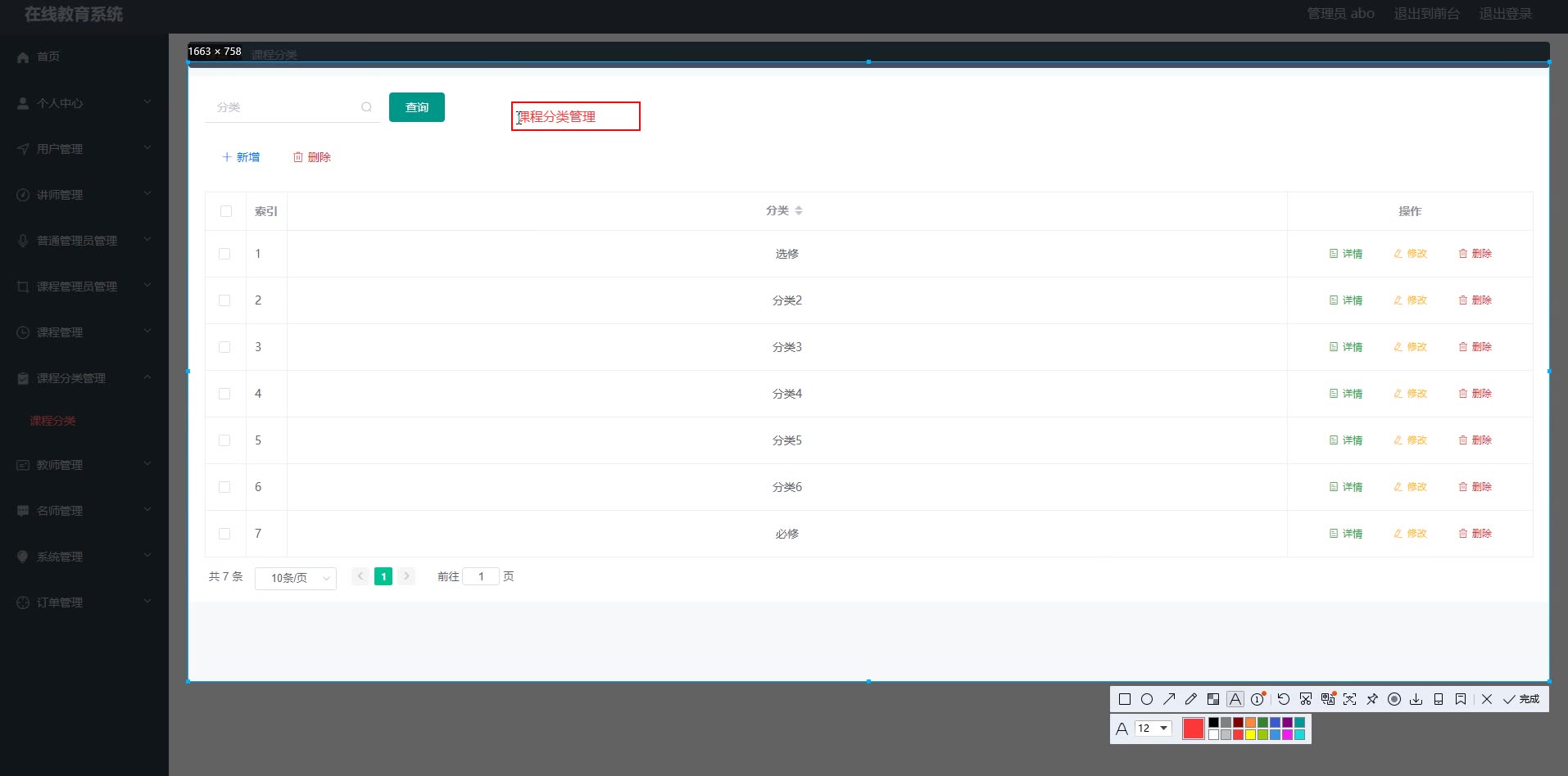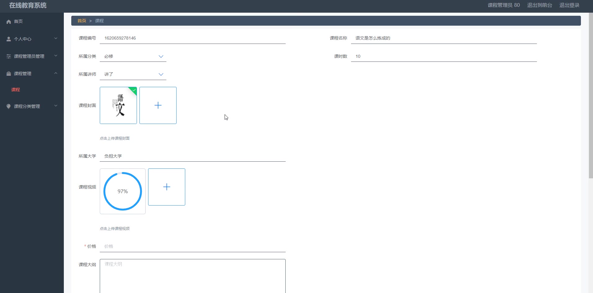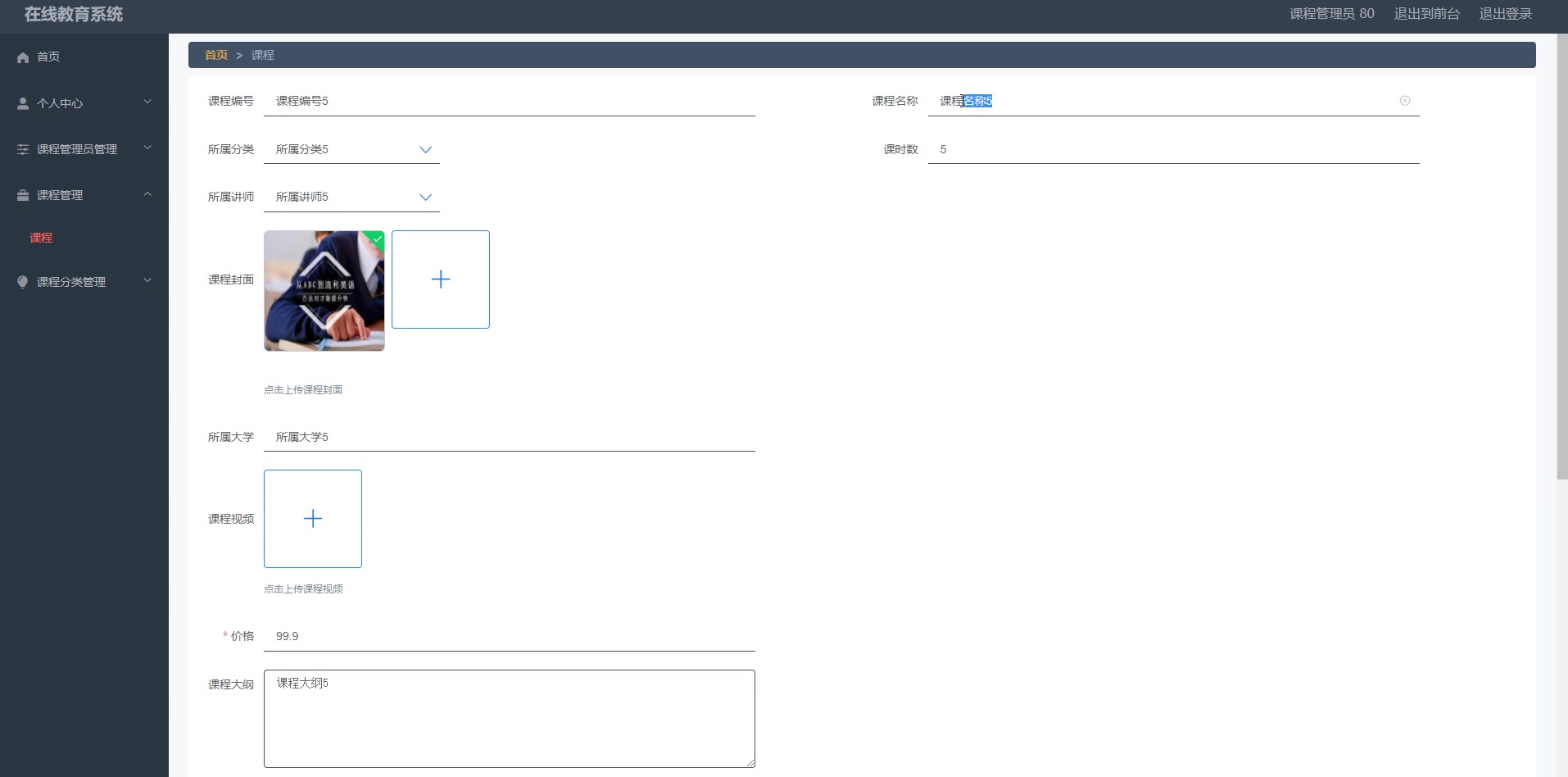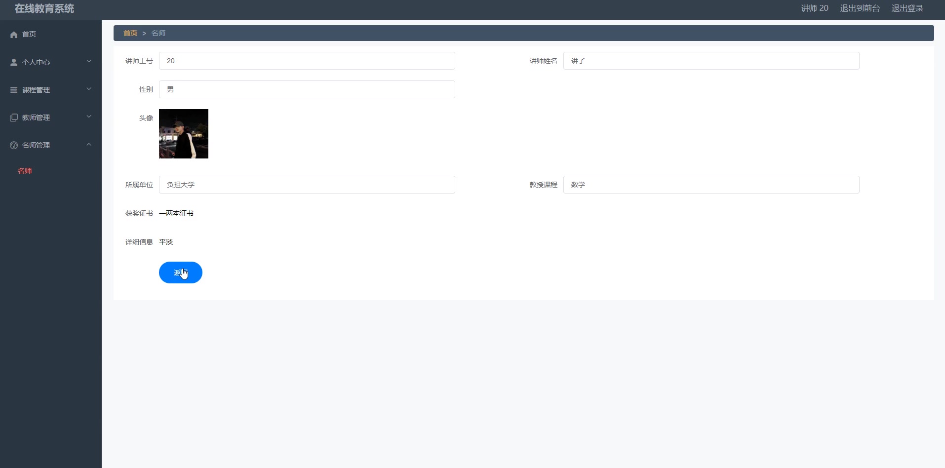 本在线教育系统管理员功能有个人中心,用户管理,讲师管理,普通管理员管理,课程管理员管理,课程管理,课程分类管理,教师管理,名师管理,系统管理,订单管理。普通管理员和课程管理员都可以进行注册。用户也可以注册。用户可以购买课程,收藏课程,收藏教师。因而具有一定的实用性。