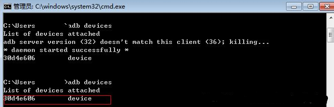 2.打开cmd输入:adb devices,当屏幕上出现一串字符,后面显示devices说明连接成功(出现其它的提示,得检查自己的环境了)
