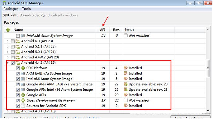 3.勾选你要下载的API版本和对应的android版本,后面模拟器会用到(不下载用其它模拟器也行,或者真机),然后坐等下载