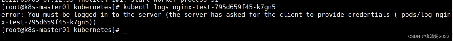 无法通过kubectl 命令查看应用pod日志,报error: You must be logged in to the server (the server has asked for the client to provide credentials ( pods/log nginx-test-795d659f45-k7gn5))错误。